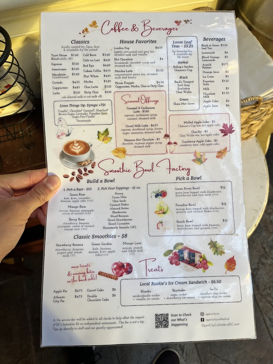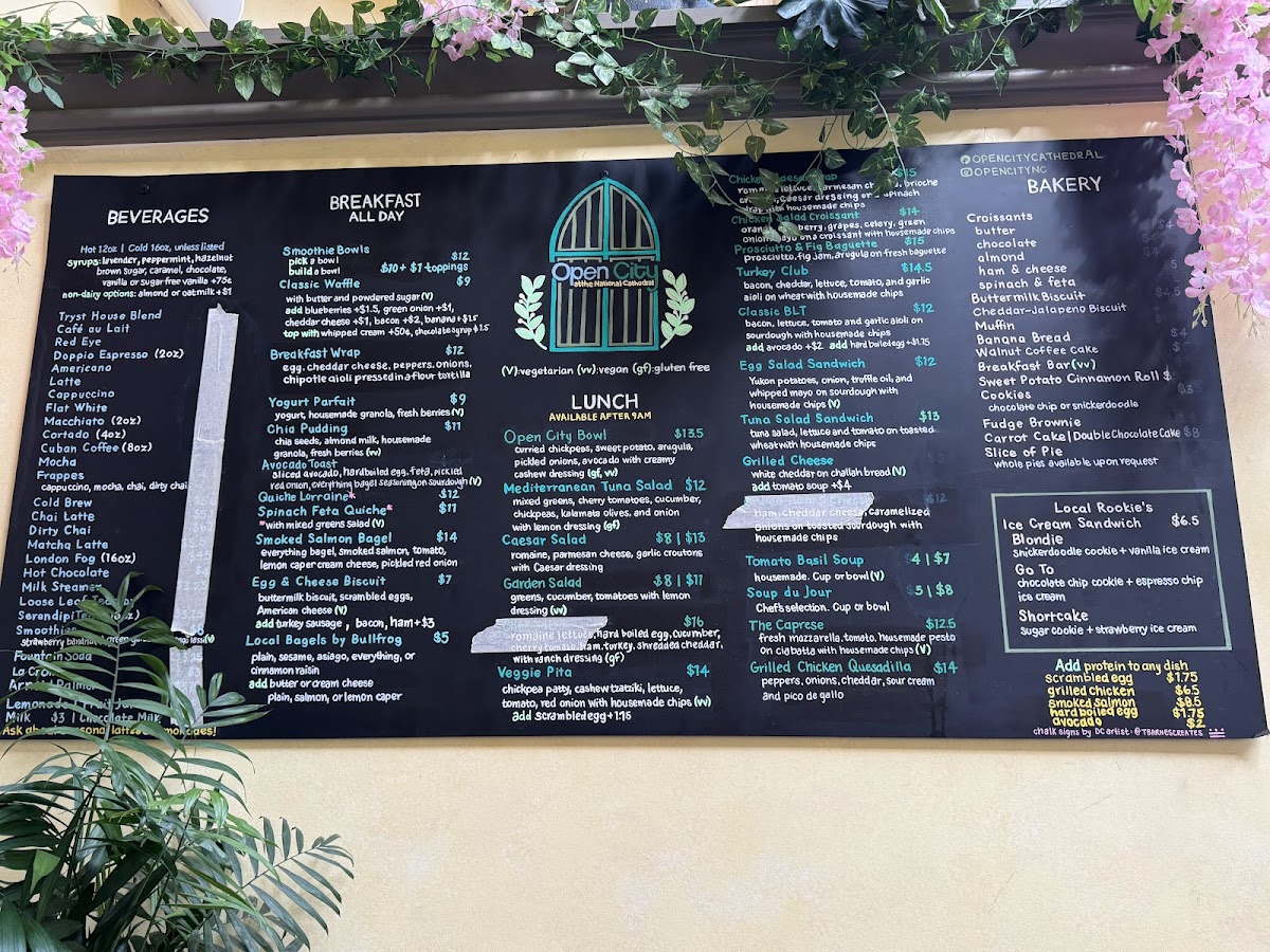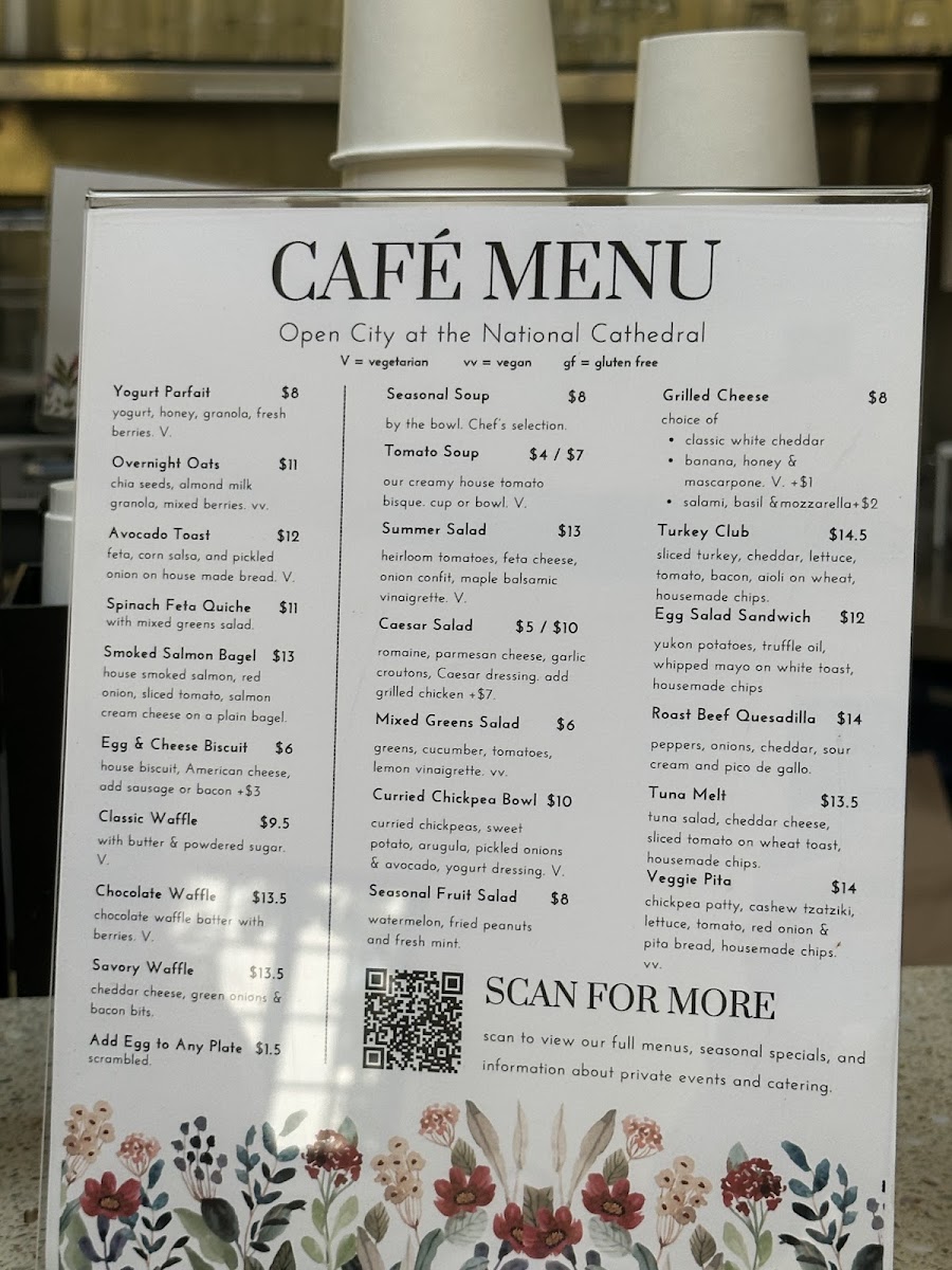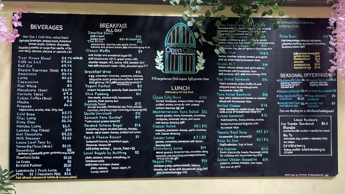 Open City at the National Cathedral offers a delightful menu that caters to both casual diners and those seeking a quick bite. Nestled within the stunning backdrop of the cathedral, this café emphasizes freshness and flavor in every dish.